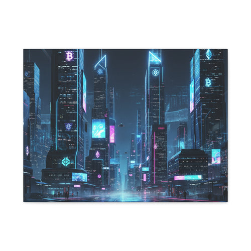 Cyberpunk Crypto Cityscape Canvas Print — Futuristic Neon Skyline Wall Art